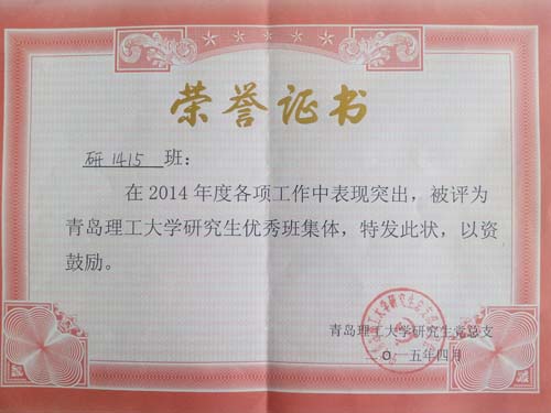 为争得优秀班集体荣誉,我院研究生1415班自3月初即着手准备,答辩PPT素材收集、整理、制作等全过程以及答辩的彩排都凝聚着同学们的辛勤汗水,通过层层筛选和精心准备,在学院领导和班主任老师大力支持和帮助下,我院1415班荣获2014年度优秀班集体荣誉称号。